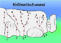 Skizze einer Kletterroute mit mehr oder weniger differenzierter Darstellung (Symbole) von Geländeeigenschaften. Topografische Kletterführer gibt es für nahezu alle Klettergebiete.